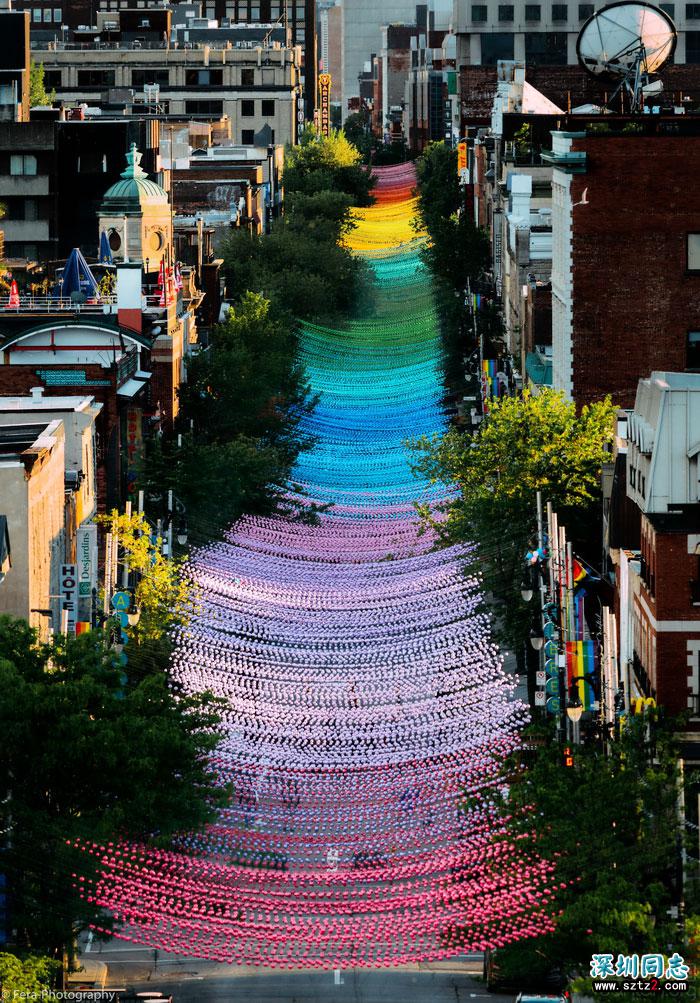 蒙特利尔市中心的圣凯瑟琳街挂上了成千上万只气球,组成同志彩虹旗和跨性别骄傲旗